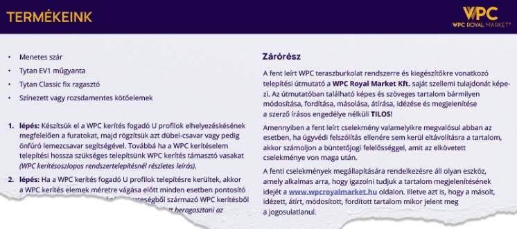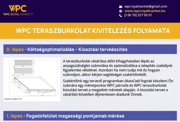Az alábbi videók, mind saját készítésű, a WPC Royal Market tulajdonát képzik. Felhasználása marketing vagy oktatási célra a szerző írsos engedélye nélkül tilos! Az alábbi videókban szereplő szakmai tudás 10 évre nyúlik vissza, így elmondhatjuk, hogy egyik legnagyobb szakmai tudás birtokában állunk. Kivitelezéseink 5 év garanciával készülnek.